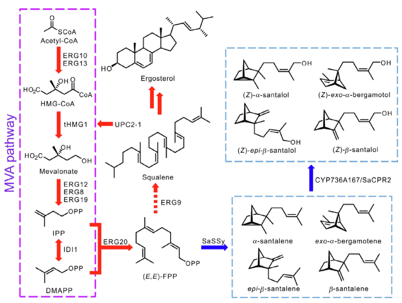 S. cerevisiae通过MVA途径合成IPP和DMAPP。在这一途径中,ERG10(乙酰乙酰-CoA硫醇酶)催化两分子乙酰-CoA的缩合,生成一分子乙酰乙酰-CoA,由ERG13(HMG-CoA合成酶)转化为3-羟基-3-甲基-谷氨酰胺(HMG-CoA)。随后,HMG-CoA被HMG1或HMG2(HMG-CoA还原酶)还原,产生核心中间体甲羟戊酸,通过ERG12(甲羟戊酸-5-激酶)、ERG8(磷酸甲羟戊酸激酶)和ERG19(甲羟戊酸焦磷酸脱羧酶)相继催化的一系列转换,从中产生IPP。最后,在IDI1的催化下,IPP和DMAPP之间实现可逆转换。然后在ERG20(FPP合成酶)的催化下从DMAPP和IPP合成FPP。如上所述,通过在S.cerevisiae中引入外源STS、CYPs和细胞色素P450还原酶(CPRs),可以重建檀香烯和檀香醇的生物合成途径。为了增加IPP和DMAPP的供应,人们在优化S. cerevisiae的MVA途径方面做了很多努力。HMG-CoA的还原是MVA途径的主要限速步骤。HMG1和HMG2都含有一个锚定跨膜结构域和一个催化结构域,过量表达截短的HMG1(tHMG1,HMG1的催化结构域)已被报道为提高大鼠萜类生产的有效策略。转录因子UPC2在激活MVA途径的基因成员的表达方面起着关键作用,其突变体UPC2-1的过度表达可以提高MVA途径的效率。因此,tHMG1、UPC2-1和ERG20经常被过量表达,以提高S.cerevisiae生产檀香烯和檀香酚的效率。