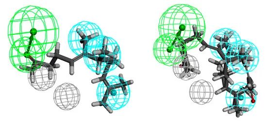 仅对活性最强的物质进行药效团建模(图10)。得到的结果证实了前面所描述的关于所需链长度和官能团的阐述的观察结果。与使用本文描述的所有化合物所得到的更一般的模型相比,上述模型可被认为更具限制性。虽然这些模型的外观不同,但它们的分析得出了相同的结论。长链化合物具有较高的抗菌活性。此外,官能团的暴露一度是有利因素(对革兰氏阳性菌的活性),而在另一时刻则是不利因素(对革兰氏阴性菌的活性)。此外,在上述空间条件下,可以看出β-甲基取代基也起着重要的作用(在金黄色葡萄球菌的情况下)。