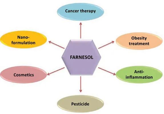 橙花醇和金合欢醇除了具有风味特性外,还具有抗菌特性。许多乳霜和营养剂中都含有法尼醇,它对引起痤疮的细菌(金黄色葡萄球菌、表皮葡萄球菌)有抑菌作用,而且不会影响皮肤上自然存在的微生物群。它阻断耐药菌株金黄色葡萄球菌生物膜的形成,并与抗生素协同作用。Brilhante等研究表明,金合欢醇单独或联合抗真菌药物对球虫属二型真菌和念珠菌临床分离株具有抑制活性。橙花醇对肠道沙门氏菌、金黄色葡萄球菌、大肠杆菌和黑曲霉等具有一定的毒性作用,并能提高抗生素的抗菌活性。Nagaki等人检测了金合欢醛对金黄色葡萄球菌的活性,发现其在分析的萜类化合物中表现出最高的活性。Shin等人评价了乙酸金合花酯抑制金黄色葡萄球菌和铜绿假单胞菌生长的抗菌活性。通过对其食品防腐性能的研究表明香叶丙酮还具有抗菌性能。此外,天然倍半萜在体内和体外对人类癌症细胞株(特别是人类恶性黑色素瘤、早幼粒细胞白血病和肺癌)具有化学预防和化疗特性。