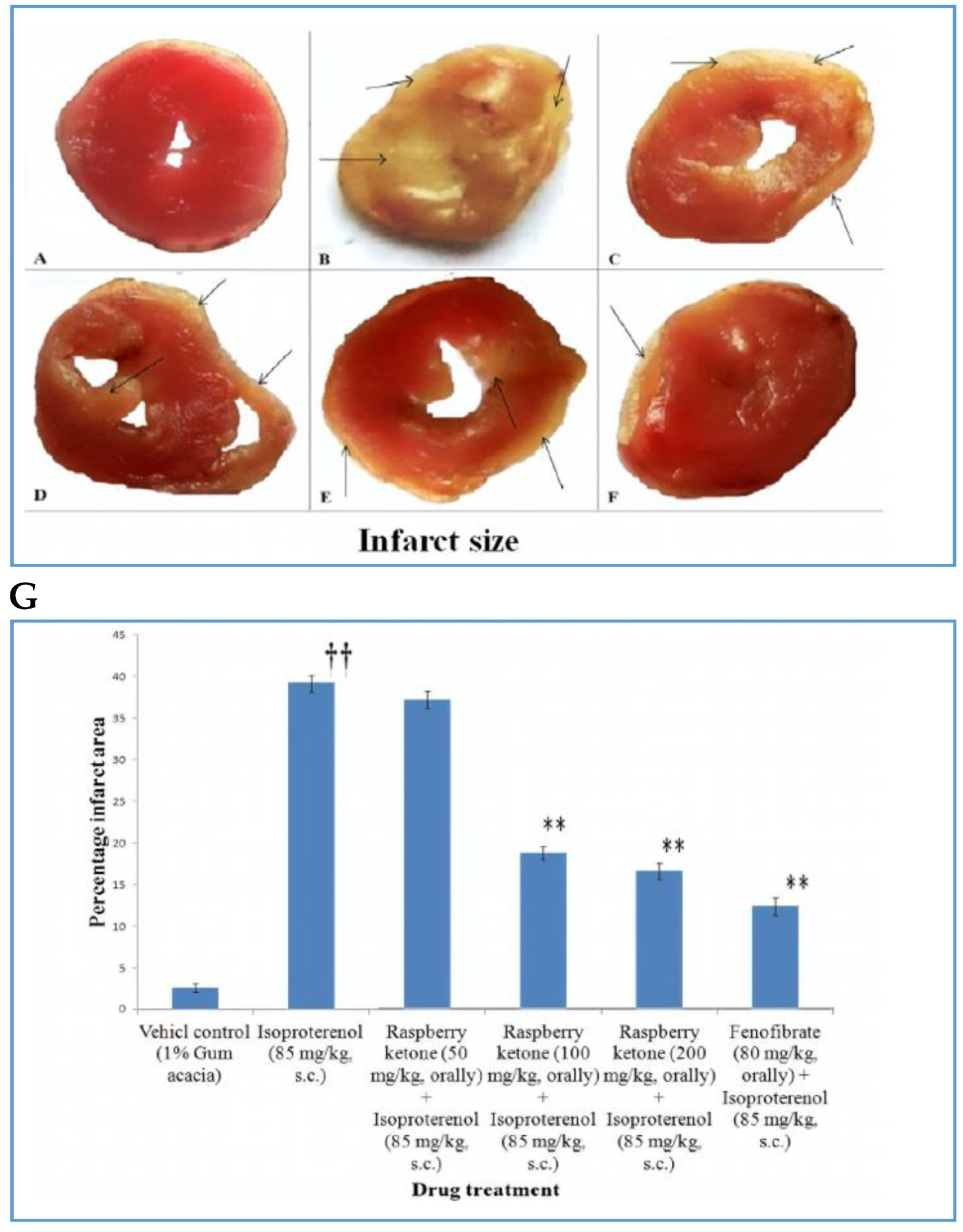图13 RK及不同药物对各组心肌梗死面积的影响(箭头所示)。(一)空白对照阿拉伯树胶(1%),(B)异丙肾上腺素(85毫克/公斤,南卡罗来纳州)(C) RK(50毫克/公斤,口服)+异丙肾上腺素(85毫克/公斤,南卡罗来纳州)(D) RK(100毫克/公斤,口服)+异丙肾上腺素(85毫克/公斤,南卡罗来纳州)(E) RK(200毫克/公斤,口服)+异丙肾上腺素(85毫克/公斤,南卡罗来纳州)(F)和非诺贝特(80毫克/公斤,口头)+异丙肾上腺素(85毫克/公斤,南卡罗来纳州)。图中为不同处理组的梗死面积百分比(G),各柱为平均扫描电镜(SEM)。通过单因素方差分析(one-way ANOVA)和Dunnett t检验确定显著性:** p < 0.01与毒性对照;††p < 0.01与空白对照。