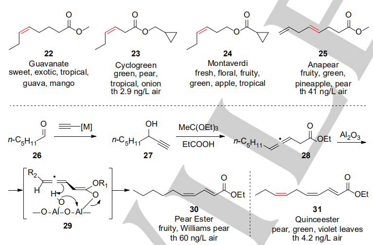 在自然界中,叶子和水果的青香香气主要由所谓的“叶醇”(3Z)己烯-1-醇(163)及其相应的醛(154)发出,这两种物质都是从亚麻酸中生物衍生出来的。[30]因此,许多青香香韵的香气分子展现出相关的结构,同时连接到其他嗅觉方向。在现代香水创作中,青香香韵为有着甜美果香的香气分子结构提供了令人耳目一新的转折点。青香和果香的连接上由许多不饱和酯类化合物(方案3),尤其是Guavanate (22)、Cyclogreen(23)、Montaverdi(24)和Anapear(25)组成,后者在《男性痴迷之夜》(Calvin Klein,2005)中被提到,为这种东方香调的香水提供了梨的清新感。在香水和香料中最具特色的一种梨成分可能就是梨酯(30)了,其具有一种很容易辨认的Williams梨香味。这种天然存在的成分可以通过乙炔化物加成己醛(26)来安静地制备[31],将27与原乙酸三乙酯进行约翰逊-克莱森重排,生成丙二烯28。然后,在氧化铝存在下加热,将其选择性异构化为梨酯中的(2E,4Z)-二烯。据信,这种异构化是通过三油酸酯29从烯的最小阻碍面质子化进行的,从而形成关键的(Z)-烯烃。[32]在流行的梨香香气中,Quinceester(31)也很突出。[33]额外的(Z)-烯烃带来了令人明亮的青香,为经典的梨香香气带来清新。Quinceester在来自利基品牌术语“para_íso”(2018)中起作用,该术语专门强调合成成分。