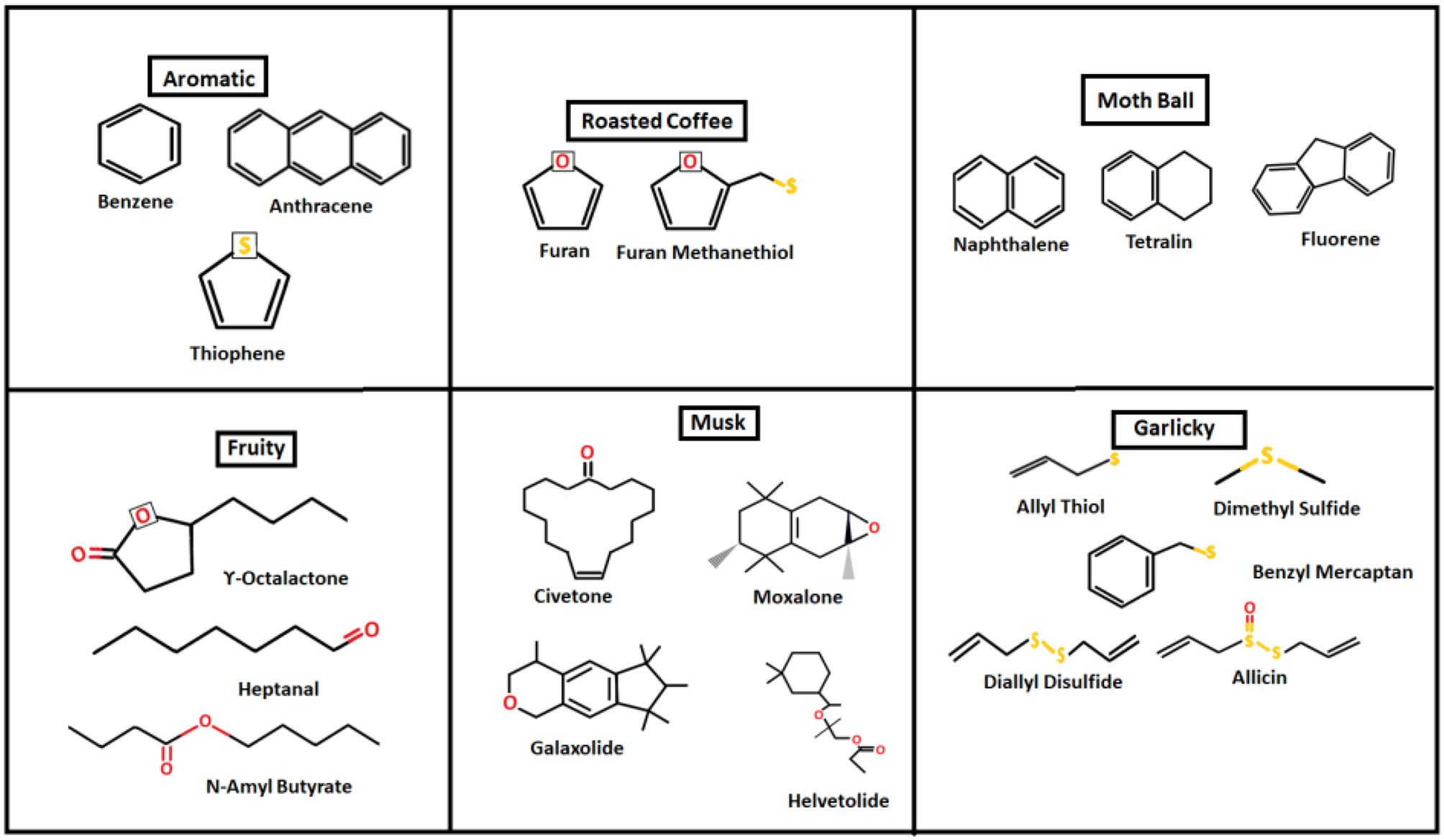 表1.本研究中使用的一组呈香分子,显示其结构和感知(气味)分类,即芳香、咖啡烘烤香、樟脑球香、果香、麝香和大蒜香。